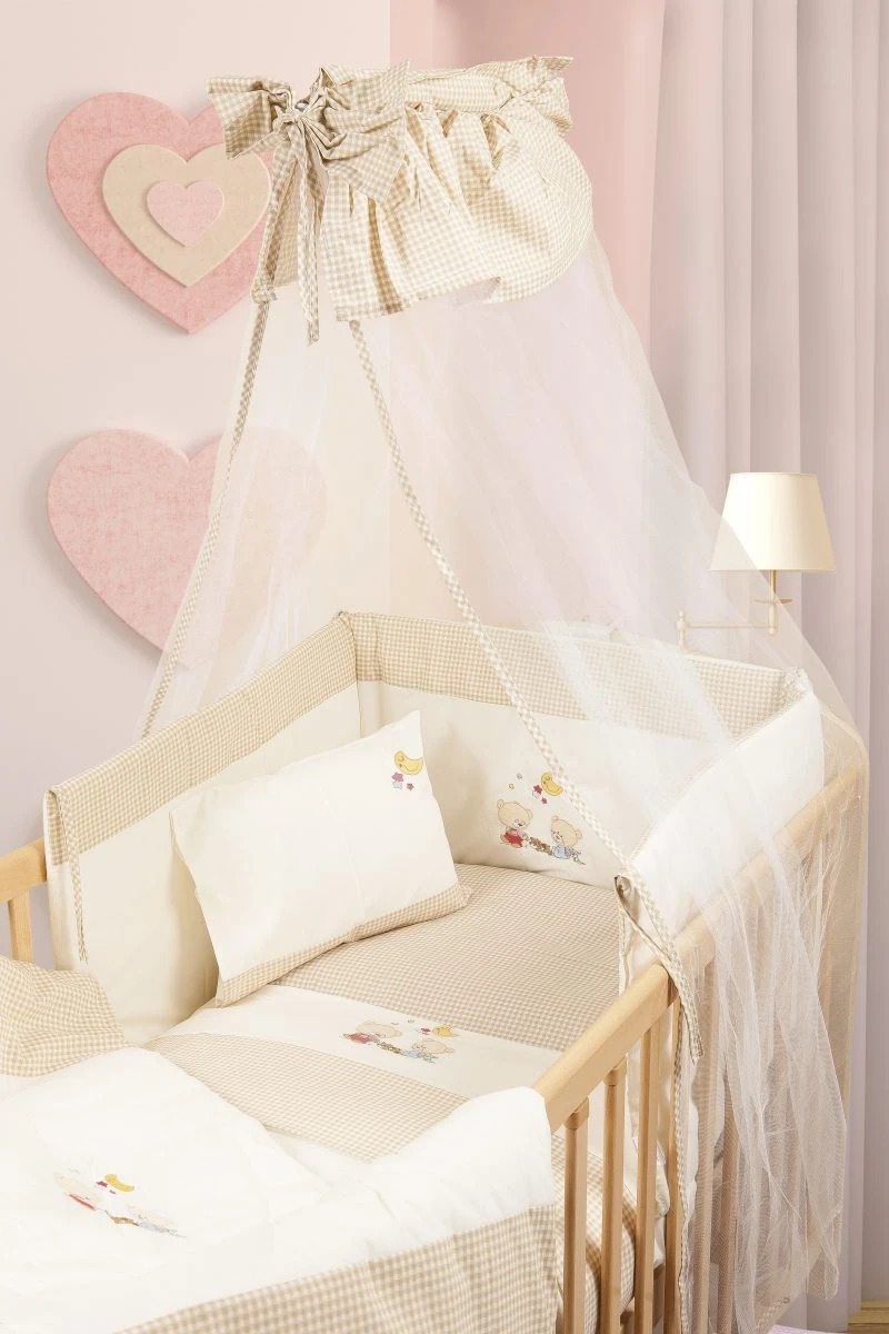 Σετ κρεβατιού 7τμχ μπεμπέ, 100% βαμβάκι σε εκρού - μπεζ χρώμα από την Dimcol. Το σετ περιλαμβάνει: 1 παπλώμα 100x140εκ., 1 κουνουπιέρα 160x490εκ., 1 πάντα 192x40εκ., 1 πανωσέντονο, 1 κατωσέντονο, 1 μαξιλαροθήκη και 1 μαξιλάρι (γεμάτο).
