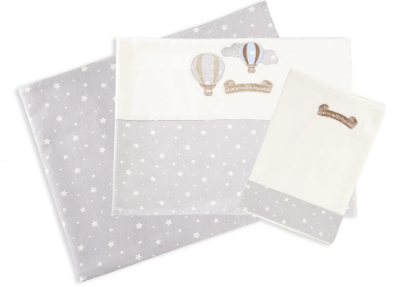 Σετ σεντόνια μπεμπέ 100% βαμβάκι περκάλι,144 κλωστών με κέντημα και φάσα σε εκρού - γκρι χρώμα Αερόστατο 01 από την Dim Collection. Το σετ περιλαμβάνει: 2 σεντόνια 120x170εκ. και 1 μαξιλαροθήκη 30x40εκ.
