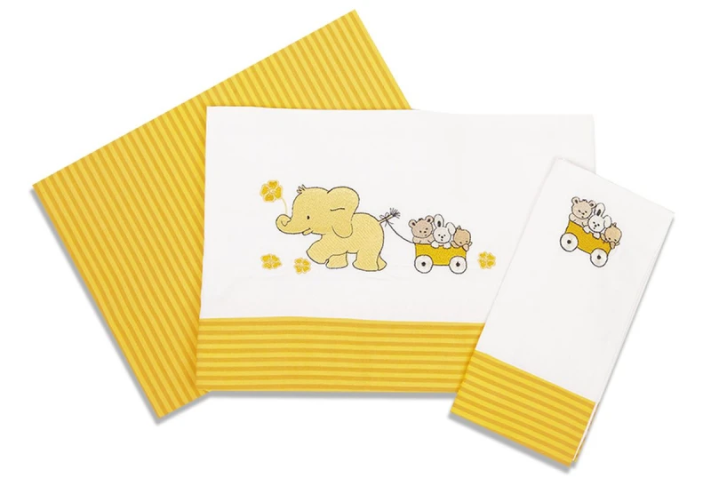 Σετ σεντόνια μπεμπέ 100% βαμβάκι περκάλι,144 κλωστών με κέντημα και φάσα σε λευκό χρώμα με πορτοκαλί - κίτρινες ρίγες Ελεφαντάκια 112 από την Dim Collection. Το σετ περιλαμβάνει: 2 σεντόνια 120x170εκ. και 1 μαξιλαροθήκη 30x40εκ.