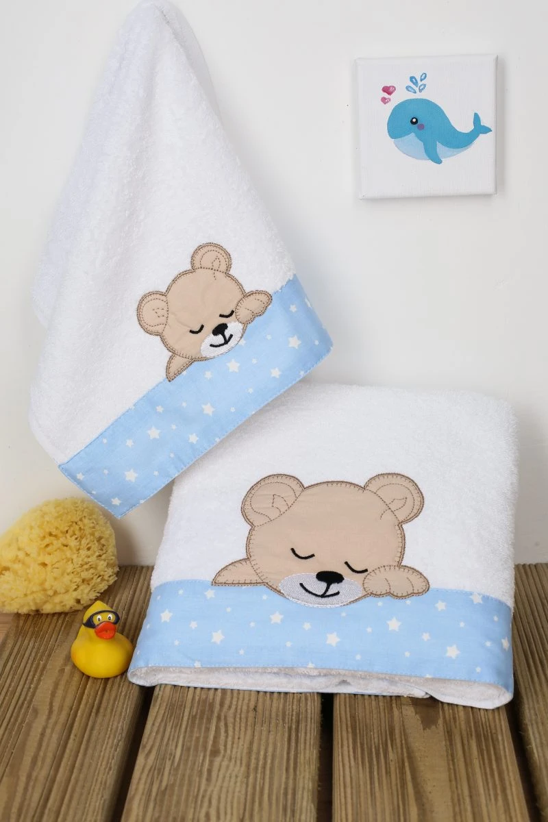 Σετ πετσέτες μπεμπέ 2τμχ με κέντημα και φάσα, 100% βαμβακερές, 400gr/m2 σε λευκό - σιέλ χρώμα Sleeping Bears Cub 11 από την Dim Collection - Το σετ περιλαμβάνει: 1 πετσέτα 30x50εκ. και 1 πετσέτα 70x140εκ.