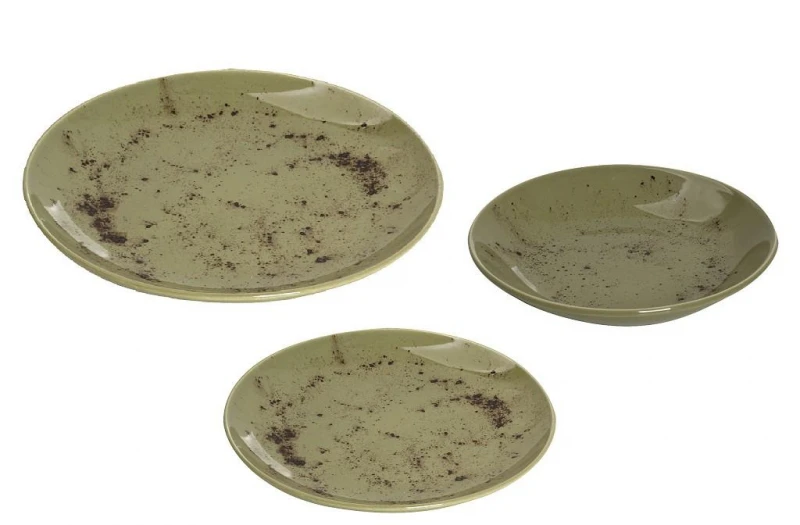 Σερβίτσιο πορσελάνης σετ 18τμχ σε πράσινο χρώμα από την ESPIEL. Το σετ περιλαμβάνει: 6 ρηχά πιάτα 26,5εκ., 6 βαθιά πιάτα 21εκ. και 6 φρούτου 19εκ.