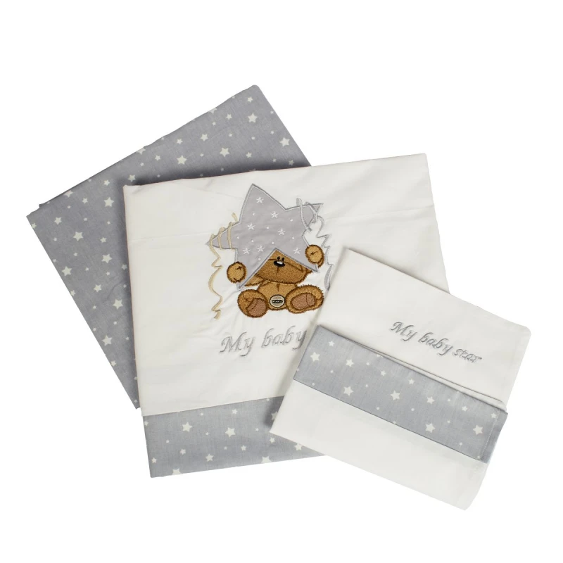 Σετ σεντόνια μπεμπέ 100% βαμβάκι περκάλι,144 κλωστών με κέντημα και φάσα σε λευκό - γκρι χρώμα Αστέρι 124 από την Dimcol. Το σετ περιλαμβάνει: 2 σεντόνια 120x170εκ. και 1 μαξιλαροθήκη 30x40εκ.