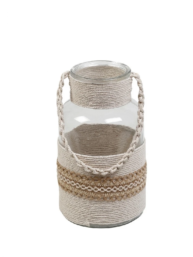 Φανάρι γυάλινο με μπεζ πλέξη από την ESPIEL - Διαστάσεις: 14x26εκ.