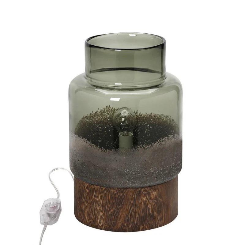 Φωτιστικό επιτραπέζιο γυάλινο με ξύλινη βάση σε χρυσοπράσινο χρώμα από την ESPIEL - Διαστάσεις: 21,5x34,5εκ.
