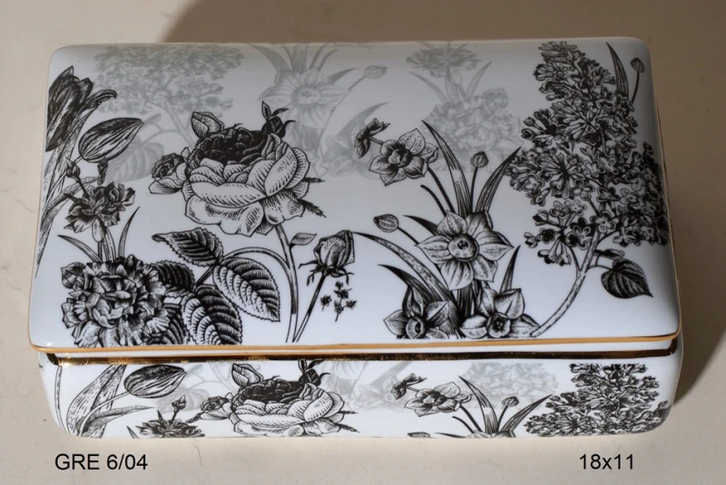 Φοντανιέρα πορσελάνης σε χρώμα λευκό με διακόσμηση μαύρα λουλούδια και τελείωμα χρυσού από την Royal Art - Διαστάσεις: 18x11εκ.