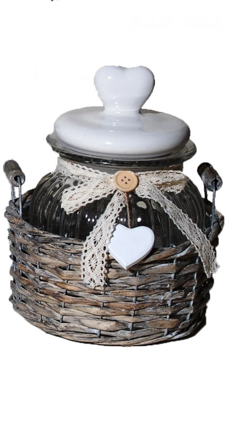 Βάζο κουζίνας γυάλινο σκεπαστό με πώμα πορσελάνης και χειροποίητη βάση από πλεκτό καλάθι από την Royal Art - Διαστάσεις: 19x22εκ.