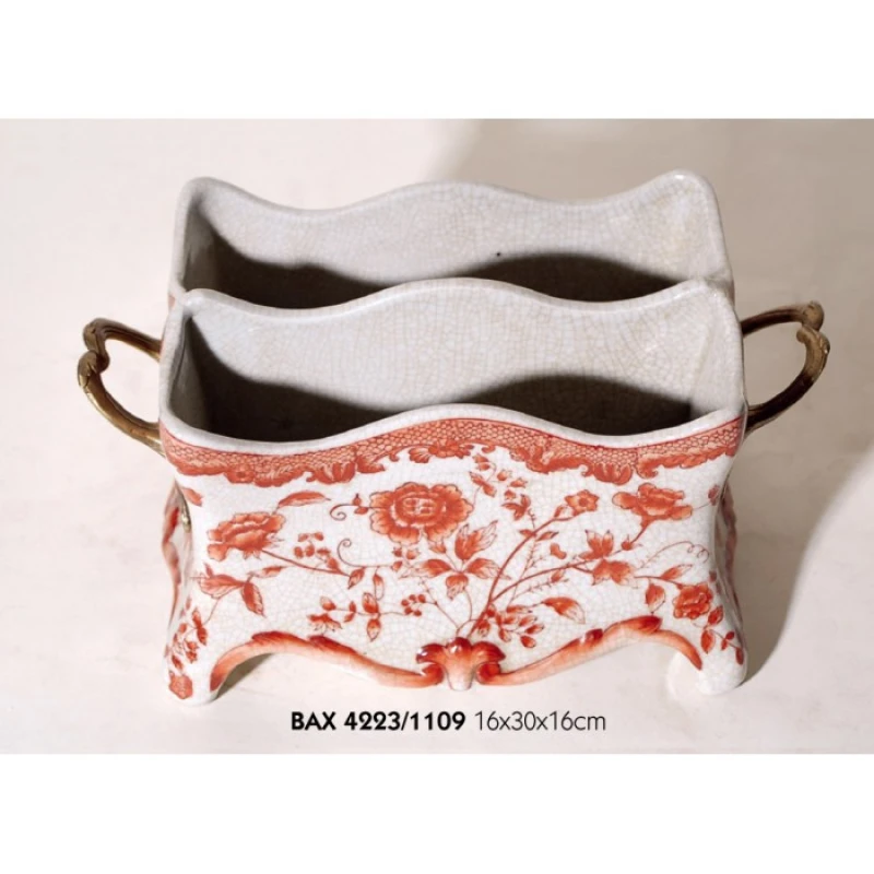 Κασπώ δύο θέσεων πορσελάνη κρακελέ με χειροποίητα ανάγλυφα κόκκινα λουλούδια ζωγραφισμένα και μπρούτζινα σκαλισμένα χερούλια από την Royal Art - Διαστάσεις: 16x30x16εκ.