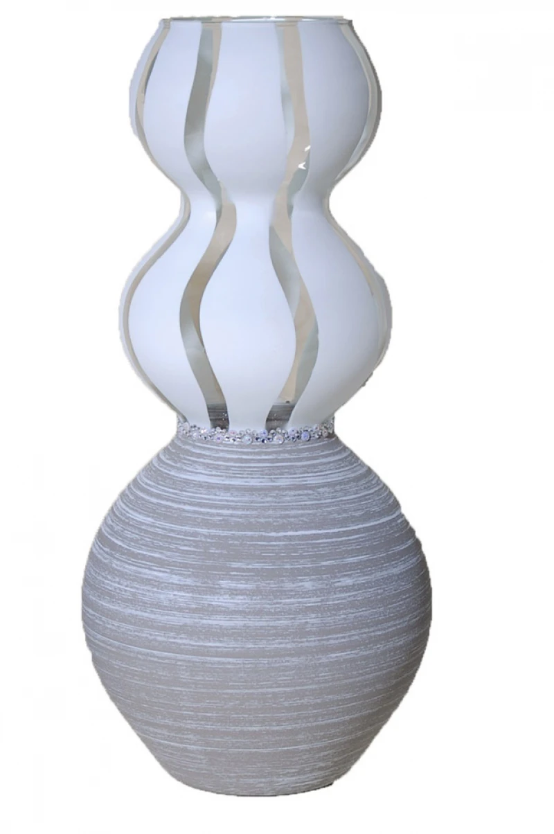 Διακοσμητικό βάζο γυάλινο με διχρωμία γκρι λευκό με διακριτική τρέσσα και στρας τύπου swarovski από την Royal Art - Διαστάσεις: 40εκ.