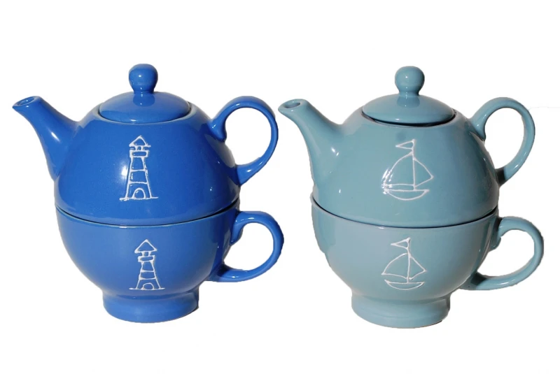 Σετ 2τμχ τσαγιερό με φλυτζάνι κεραμικό σε γαλάζιο και μπλε χρώμα με ανάγλυφα σχέδια φάρο και ιστιοφόρο, από την Royal Art Collection - Χωρητικότητα: τσαγιερό: 400ml, Κούπα: 200ml
