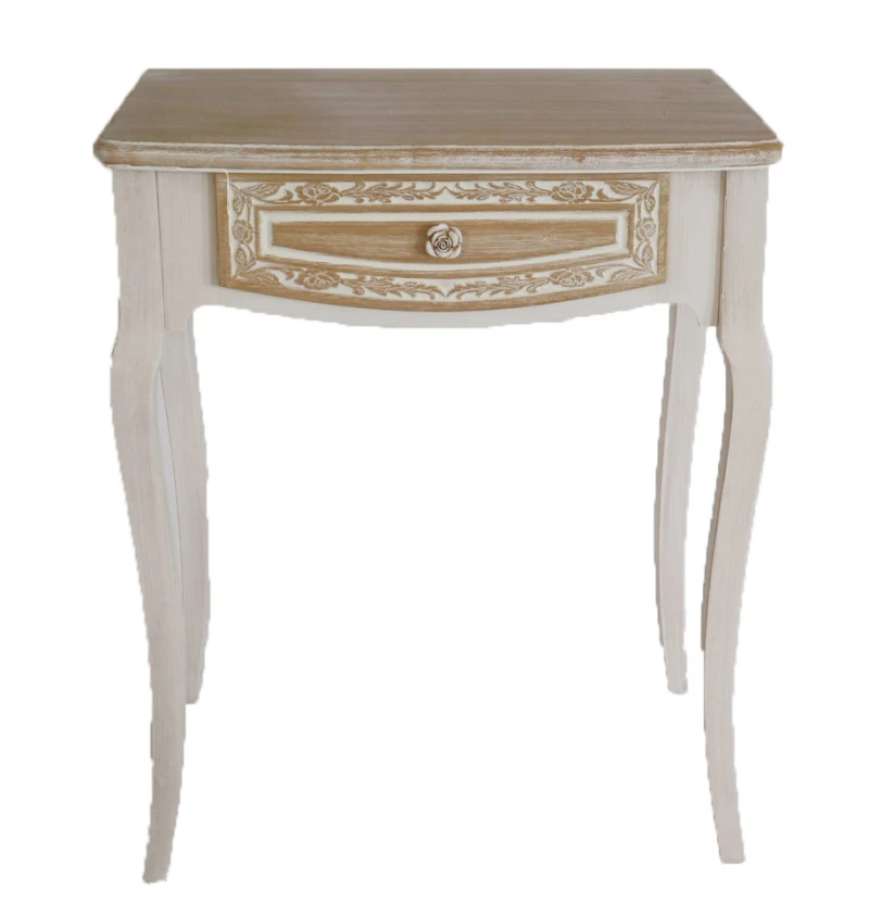 Κονσόλα ξύλινη με 1 συρτάρι σε φυσικό - λευκό χρώμα με σκαλιστό σχέδιο στο περίγραμμα και πόμολο σε σχήμα τριαντάφυλλο από την Royal Art Collection - Διαστάσεις: 60x40x72,5εκ.