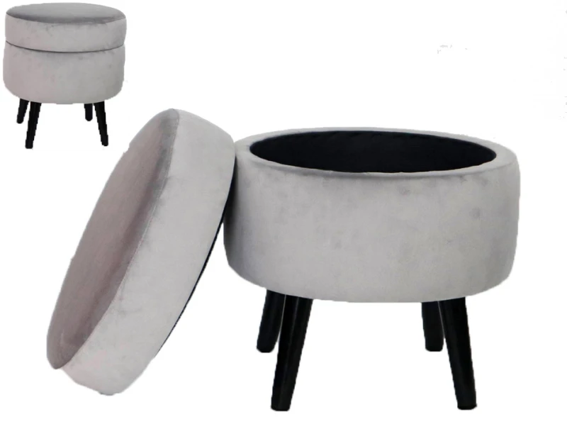 Σκαμπό - Μπαουλάκι Με Ξύλινα Πόδια Χρώματος Γκρί Και Ξύλινα Πόδια. Διαθέτει Εσωτερικό Αποθηκευτικό Χώρο Με Υφασμάτινη Επένδυση.