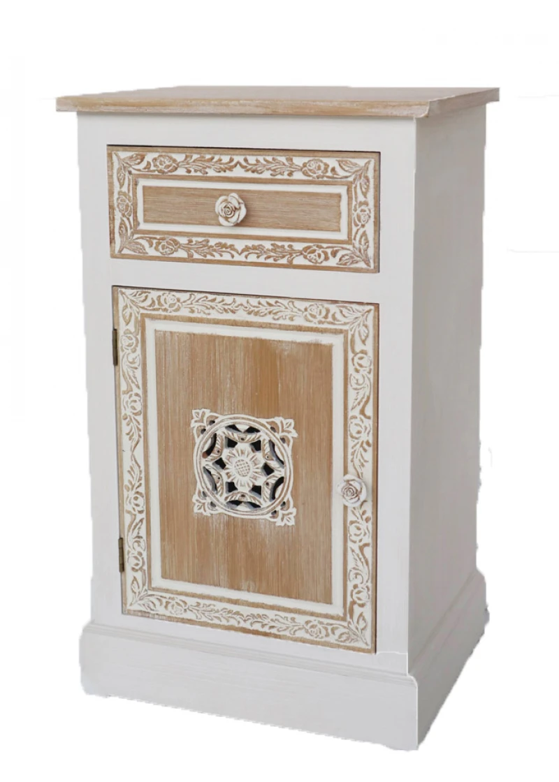 Κομοδίνο ξύλινο με 1 συρτάρι και 1 ντουλάπι σε φυσικό - λευκό χρώμα με ανάγλυφα - σκαλιστά σχέδια και πόμολα σε σχήμα τριαντάφυλλου από την Royal Art Collection - Διαστάσεις: 40x32x68εκ.