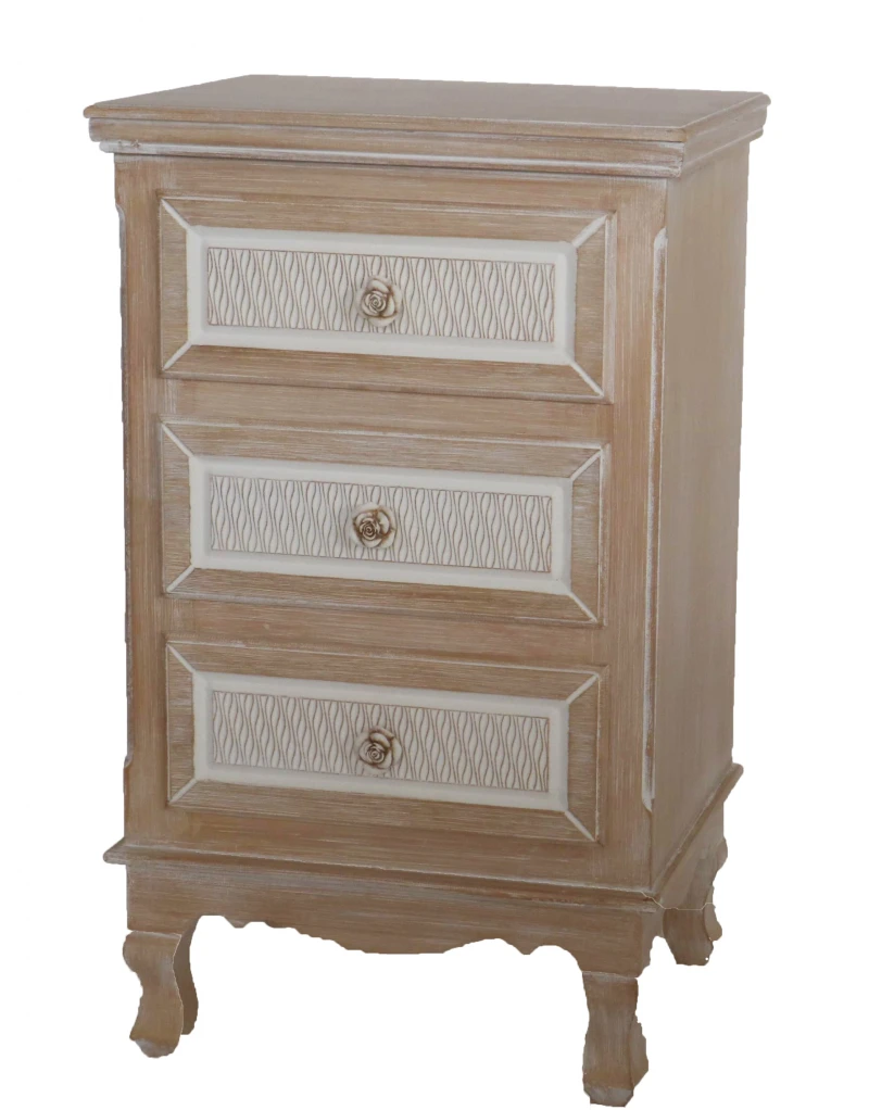 Κομοδίνο ξύλινο με 3 συρτάρια σε φυσικό - λευκό χρώμα με ανάγλυφα σχέδια και πόμολα σε σχήμα τριαντάφυλλου από την Royal Art Collection - Διαστάσεις: 41x33x68εκ.