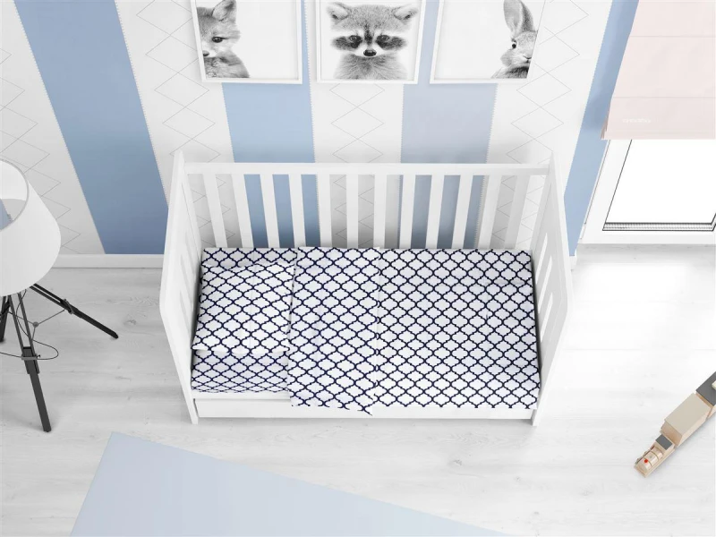 Σετ σεντόνια 3τμχ κούνιας, 100% βαμβακερά, 144 κλωστών σε λευκό - σκούρο μπλε χρώμα από την DIMcoll. Το σετ περιλαμβάνει: 2 σεντόνια κούνιας 120x160εκ. και 1 μαξιλαροθήκη 35x45εκ.
