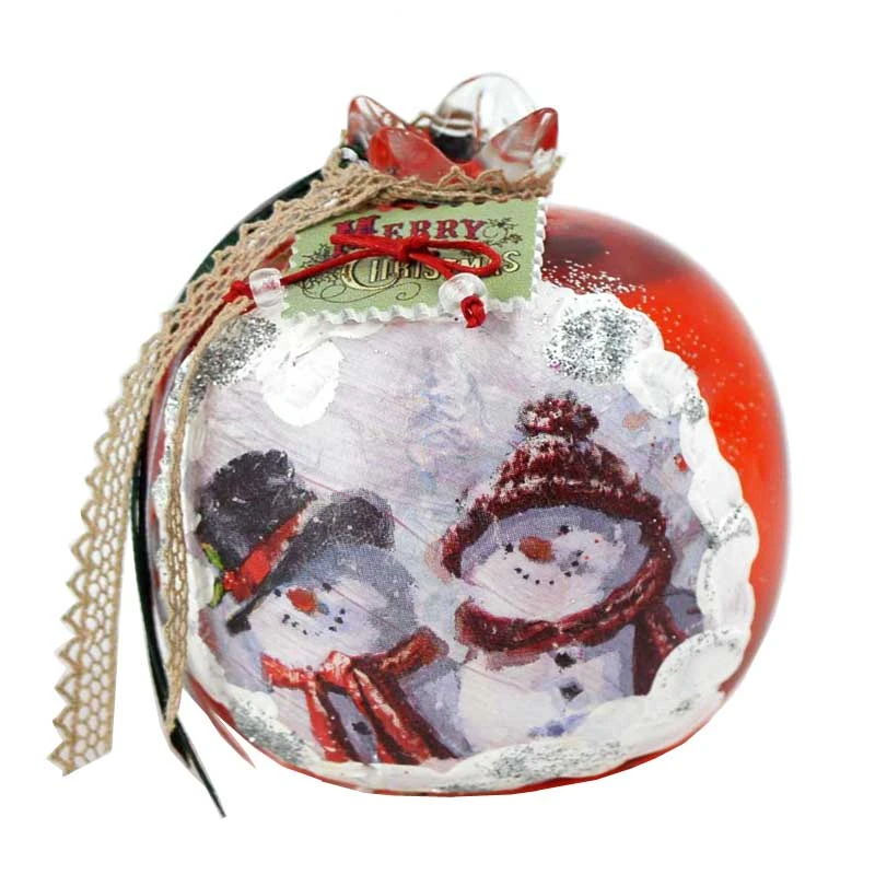 Διακοσμητικό ρόδι χειροποίητα διακοσμημένο σε κόκκινη απόχρωση με ντεκουπάζ σε παράσταση με χιονάνθρωπους και κορδέλες από την Royal Art - Διαστάσεις: 12εκ.
