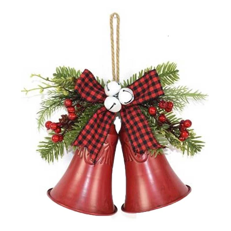Χριστουγεννιάτικα καμπανάκια κρεμαστά μεταλλικά σε κόκκινο χρώμα με φυτά και καρό φιόγκο με λευκά κουδουνάκια από την Royal Art Collection - Διαστάσεις: 22x26εκ.