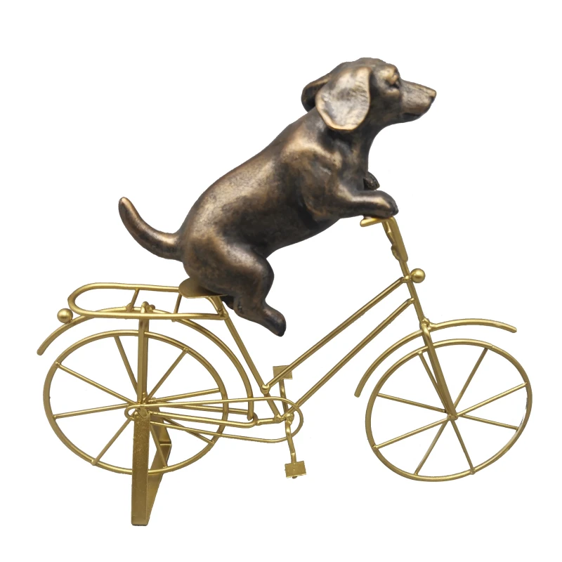 Διακοσμητικός επιτραπέζιος σκύλος σε ποδήλατο polyresin σε χρυσό χρώμα από την ESPIEL - Διαστάσεις: 26,5x6x22,8εκ.