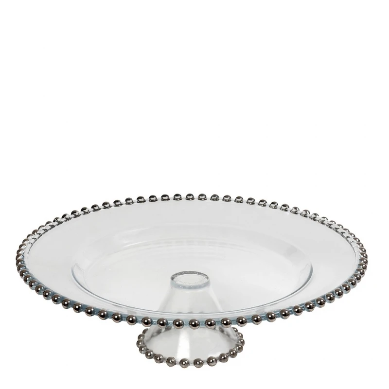 Διακοσμητική πιατέλα γυάλινη με πόδι διάφανη με ασημί χείλος της σειράς Atlas από την ESPIEL - Διαστάσεις: 34x10εκ.