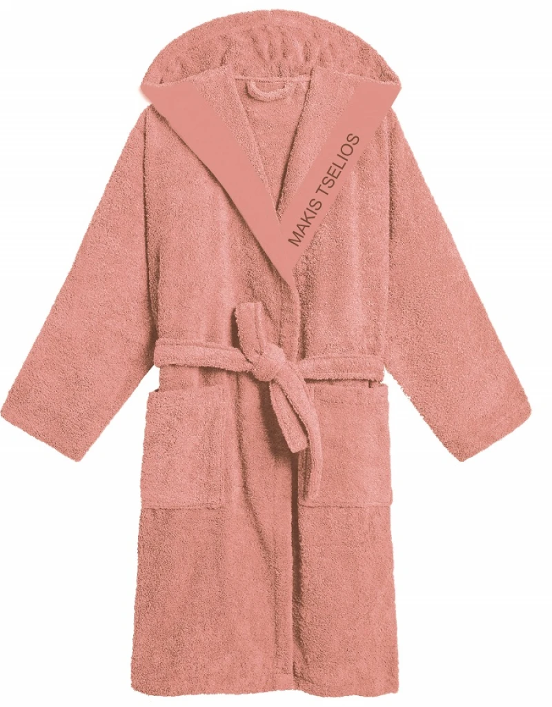 Μπουρνούζι ενηλίκων 100% βαμβακερό με κουκούλα, πλαινές τσέπες και κεντητό λογότυπο σε ροδακινί χρώμα της σειράς West από την εταιρεία Makis Tselios Home - Μέγεθος: Large.