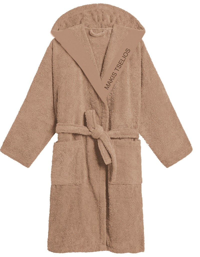 Μπουρνούζι ενηλίκων 100% βαμβακερό με κουκούλα, πλαινές τσέπες και κεντητό λογότυπο σε μόκα χρώμα της σειράς West από την εταιρεία Makis Tselios Home - Μέγεθος: Medium.
