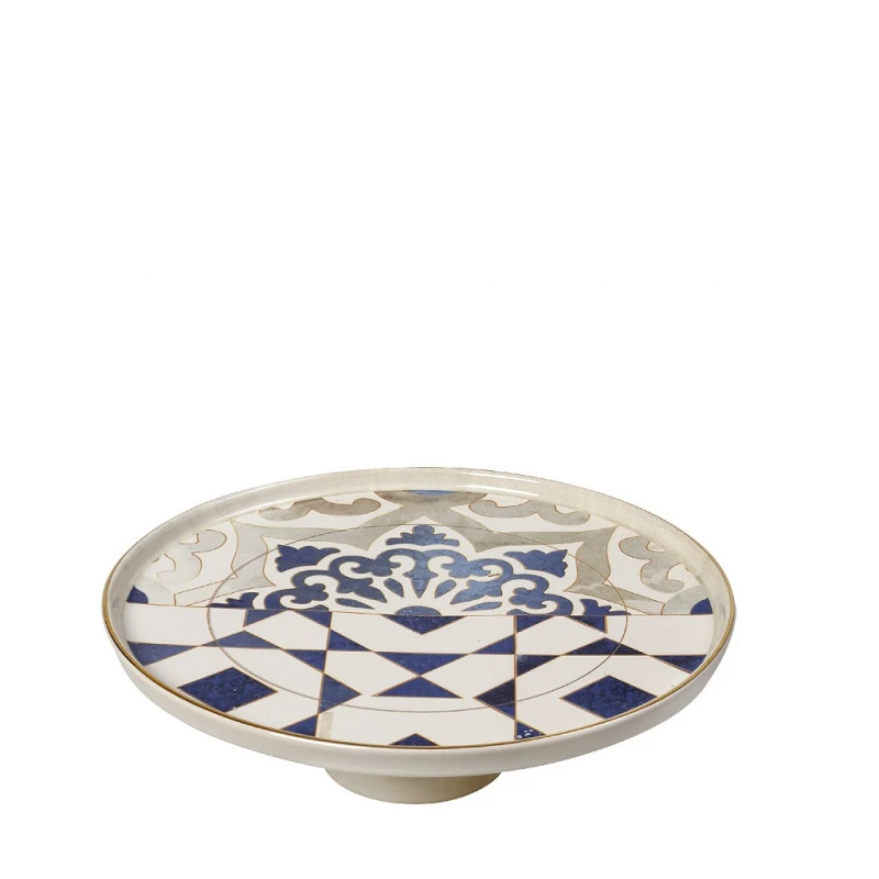 Διακοσμητική πιατέλα κεραμική με πόδι σε εκρού χρώμα με μπλε σχέδια και χρυσές λεπτομέρειες από την ESPIEL - Διαστάσεις: 20x7εκ.