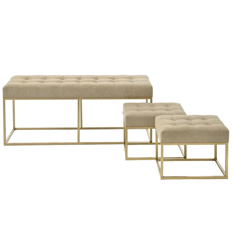 Σκαμπώ σετ 3τμχ με μεταλλικό χρυσό σκελετό και υφασμάτινο κάλυμμα σε κρεμ χρώμα από την iliadis - Διαστάσεις: 1 μεγάλο 122x42x52εκ. και 2 μικρά 48x35x39εκ.