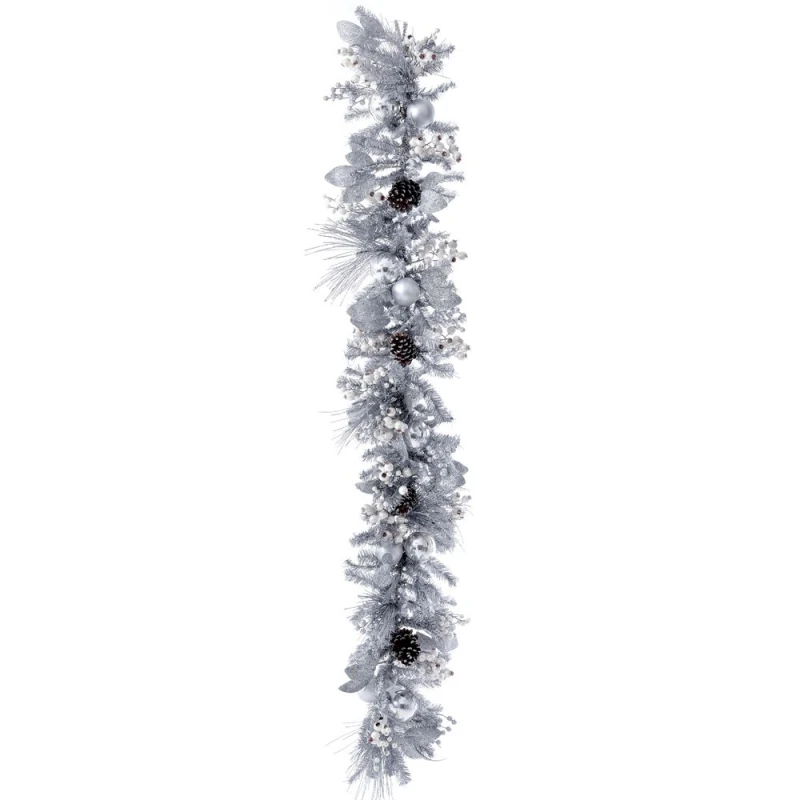 Χριστουγεννιάτικη διακοσμητική γιρλάντα στολισμένη με μπάλες σε ασημί χρώμα και διακόσμηση από την iliadis - Διαστάσεις: 180εκ.
