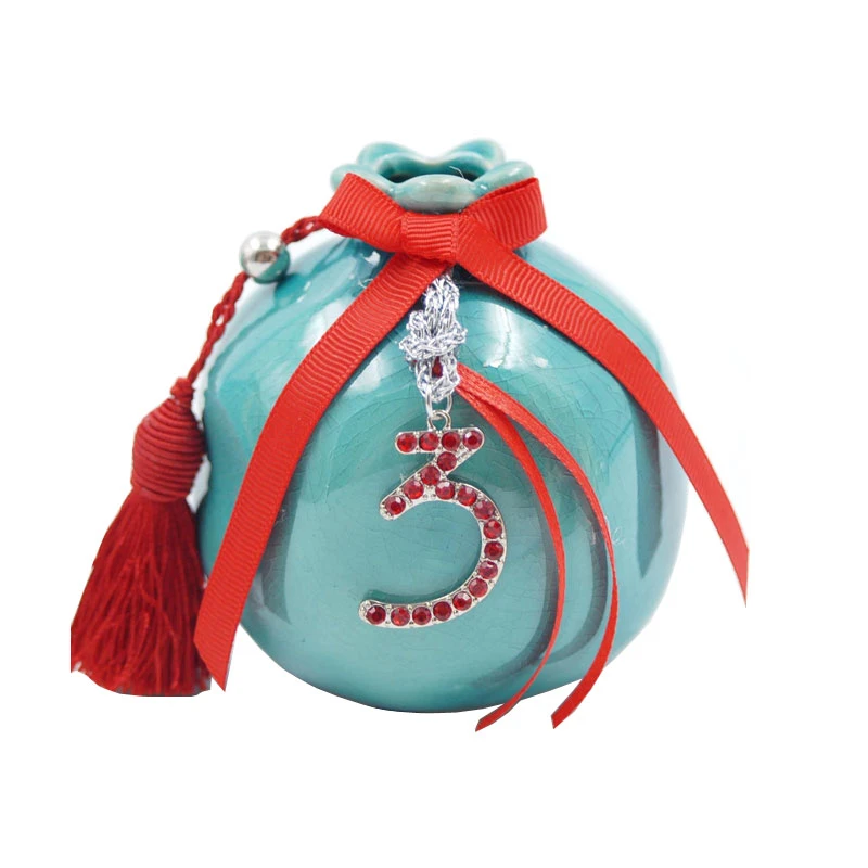 Χριστουγεννιάτικο διακοσμητικό επιτραπέζιο ρόδι κεραμικό σε τυρκουάζ χρώμα, χειροποίητα στολισμένο με μεταλλικό γούρι τρία, με κόκκινα στρας και κόκκινη φούντα από την Royal Art Collection - Διαστάσεις: 9,5εκ.