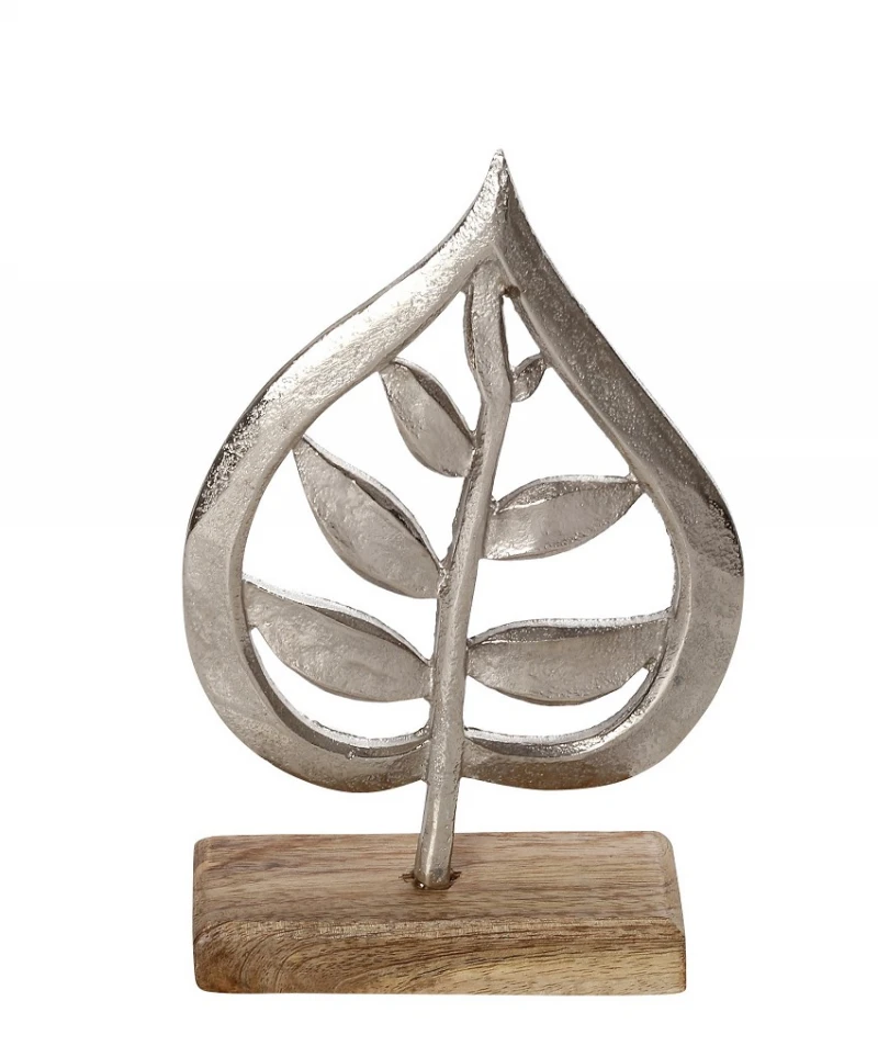 Διακοσμητικό επιτραπέζιο φύλλο, μεταλλικό σε ασημί χρώμα με ξύλινη βάση από την ESPIEL - Διαστάσεις: 18x5x27εκ. - Η ελάχιστη ποσότητα αγοράς για αυτό το προϊόν είναι 2τμχ.