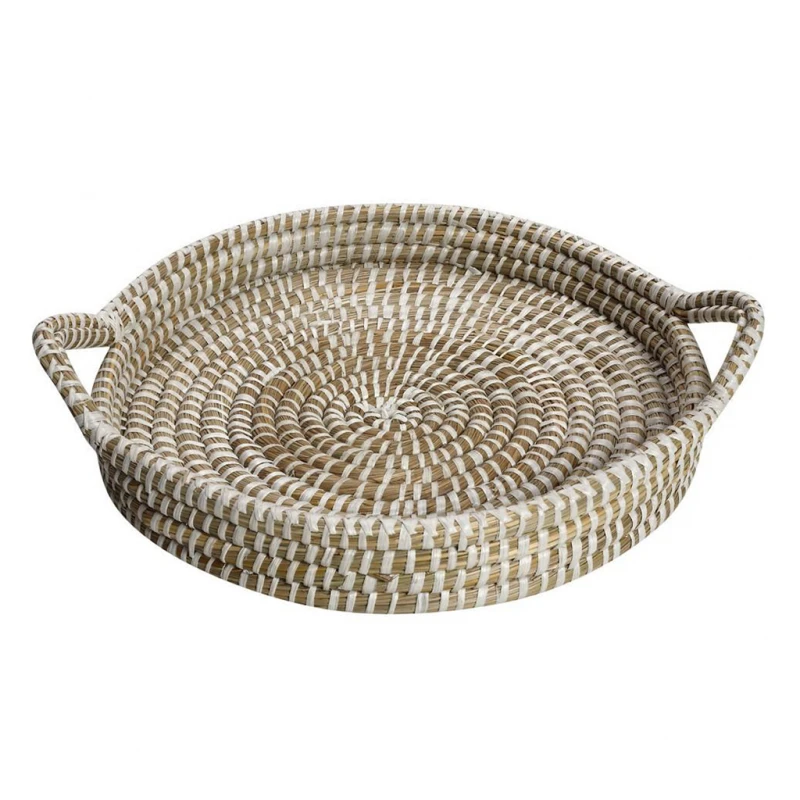 Δίσκος σερβιρίσματος στρογγυλός, ψάθινος με χερούλια σε λευκό - μπεζ χρώμα από την ESPIEL - Διαστάσεις: 40x6εκ.