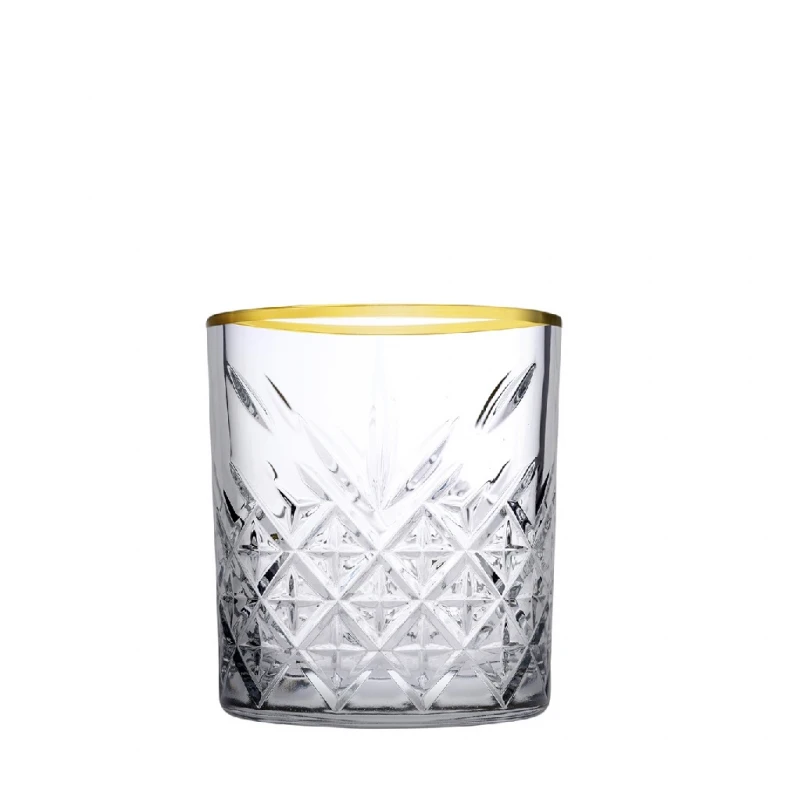 Ποτήρι ουίσκι γυάλινο golden touch της σειράς Timeless από την ESPIEL - Διαστάσεις: 8,55x9,6εκ., Χωρητικότητα: 345ml - Η ελάχιστη ποσότητα αγοράς για αυτό το προϊόν είναι 4τμχ.