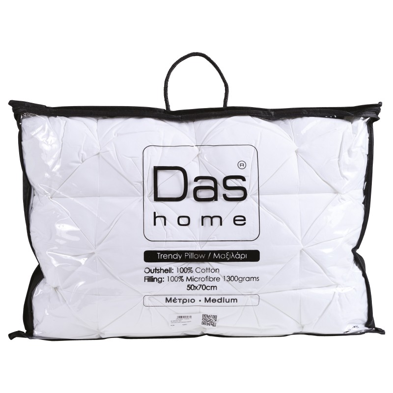 Μαξιλάρι μέτριας σκληρότητας 1300 γραμμαρίων. Το εξωτερικό του κάλυμμα είναι 100% βαμβακι, ενώ το εσωτερικό του αποτελείται από ίνες microfiber. Διατίθεται σε διάσταση 50Χ70cm. Das home...makes your house a home!