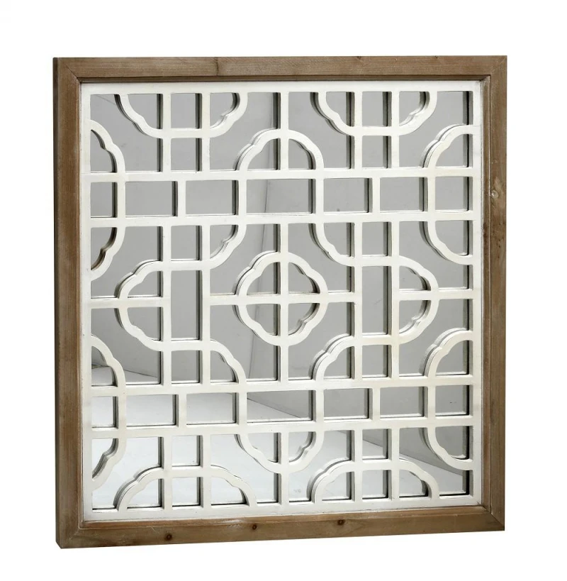 Καθρέπτης τοίχου ξύλινος τετράγωνος σε natural (φυσικό) - λευκό χρώμα με διακοσμητικά ξύλινα μοτίβα, από την ESPIEL - Διαστάσεις: 64x2,5x64εκ.